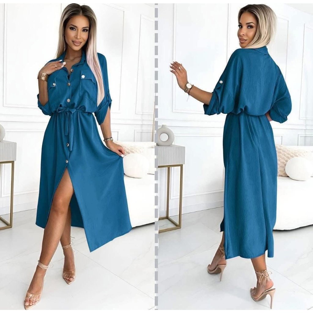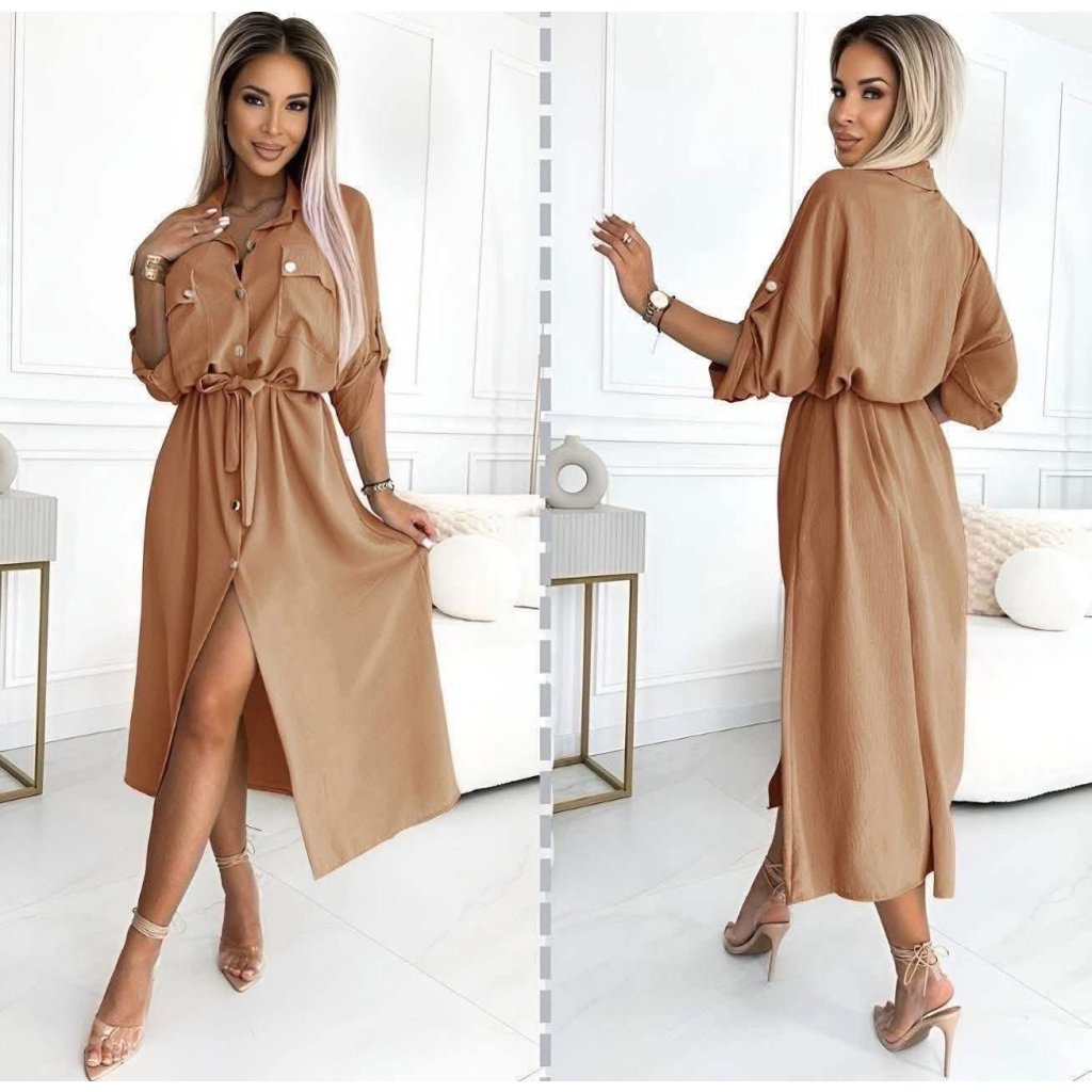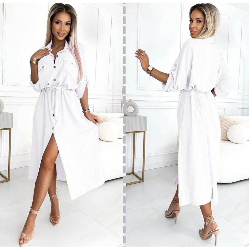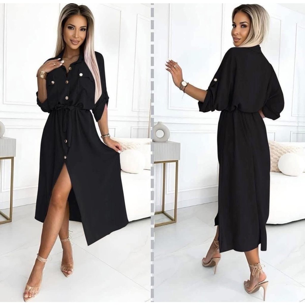 Pohodlné a přitom šik! ✨Košilový střih, zapínání na knoflíčky, v pase stahování na šňůrku pro krásné zvýraznění postavy.Rozparek dodává šatům svůdný detail.