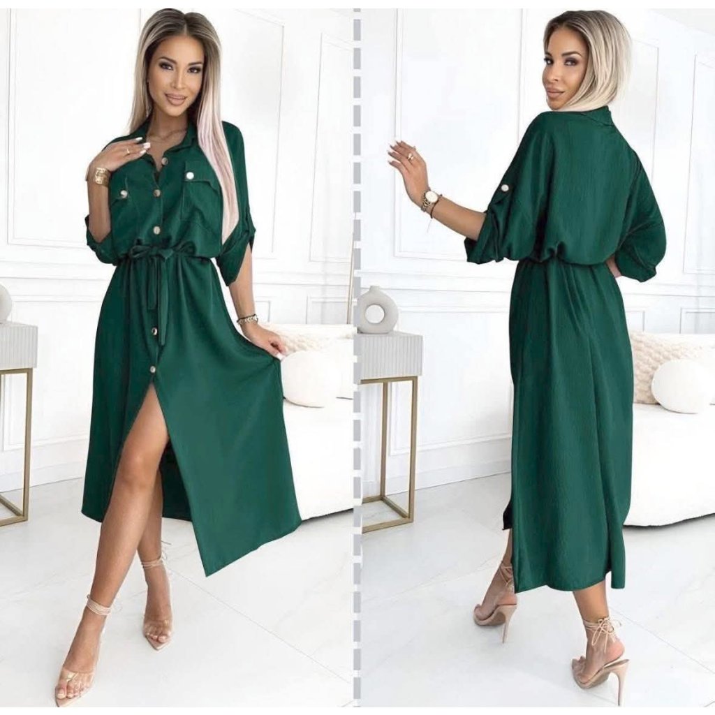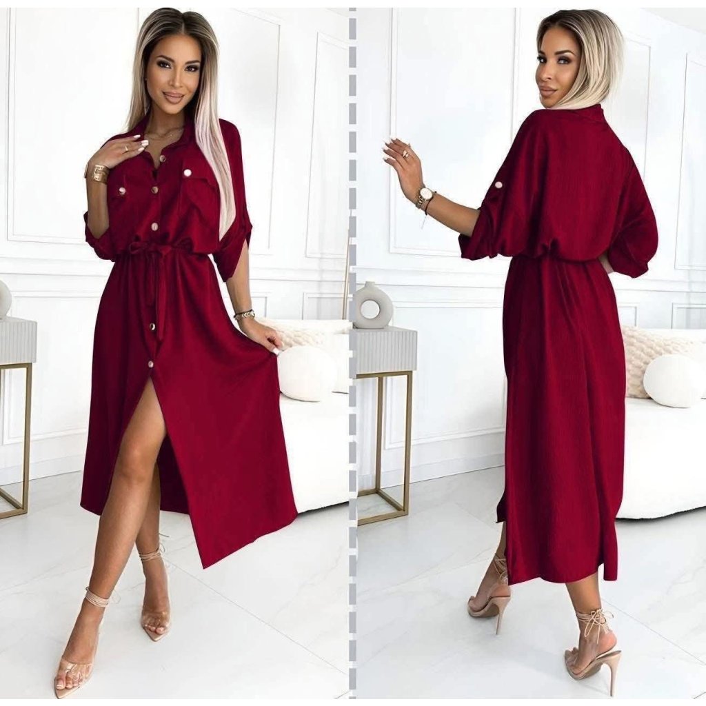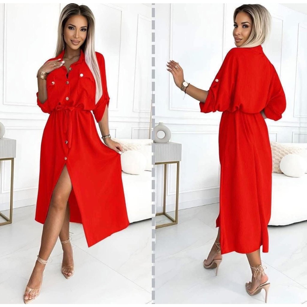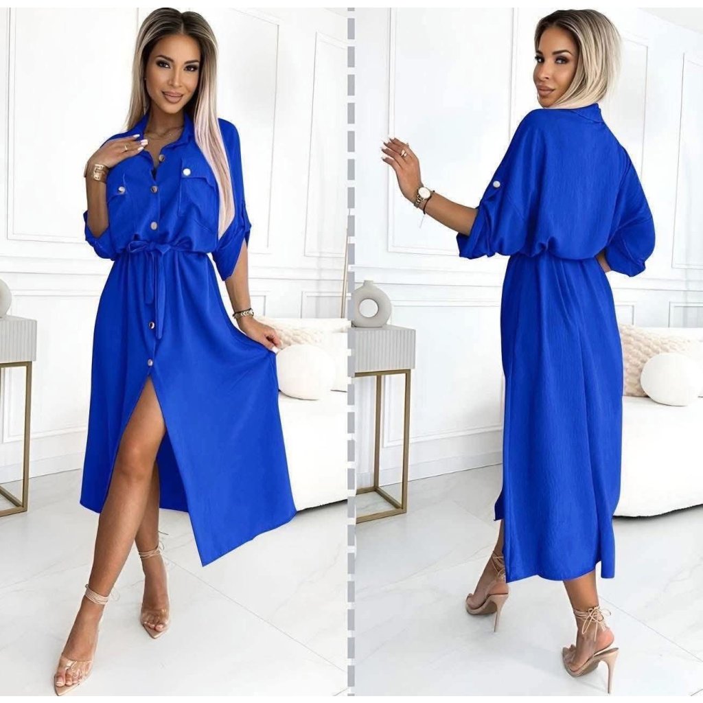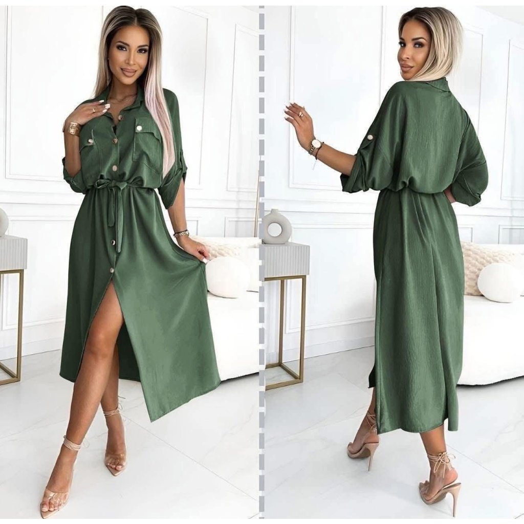 Pohodlné a přitom šik! ✨Košilový střih, zapínání na knoflíčky, v pase stahování na šňůrku pro krásné zvýraznění postavy.Rozparek dodává šatům svůdný detail.